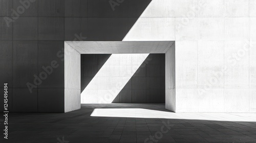 architecture, building, concrete, design, shadow, light, sunlight, modern, minimalist, geometric, structure, wall, frame, recess, space, interior, exterior, abstract, pattern, texture, background, monochrome, greyscale, line, angle, shape, form, contrast, brightness, darkness, depth, perspective, empty, blank, clean, simple, urban, contemporary, style, aesthetic, daylight, illumination, sunbeam, ray, window, opening, portal, passage