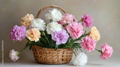 Sunlit arrangement of pastel carnations in a textured woven basket