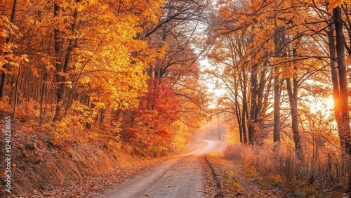 autumn, forest, landscape, autumn color, scenic, nature, tree, foliage, path, sunlight, orange, yellow, red, leaf, serenity, calmness, outdoors, timberland, seasonal, golden light, warm colors, photo, scenic view, natural beauty, environmental, sunset, sunrise, sky, pink, cloud, vibrant, serene, peaceful, trail, mist, adventure, exploration, hiking, travel, environmentally friendly, relaxation, flora, fauna, wilderness, destination, journey