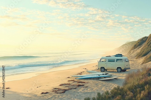 Sunlit beach scene with vintage camper van, surfboards resting n