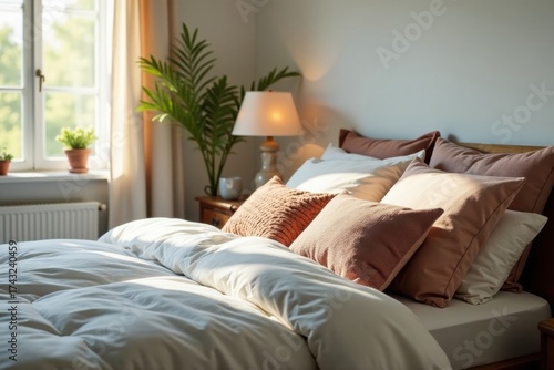 Sunlit bedroom with a cozy bed featuring soft, textured pillows and a warm lamp