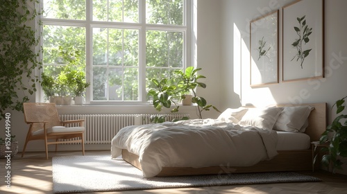 light, linen, sunlight, bedchamber, interior, decor, furniture, plant, comfortable, relaxation, home, window, simple, cosy, bed, design, calm, peaceful, calmness, natural, warm, modern, white, green, sunlit, minimalist, poster, art, wooden