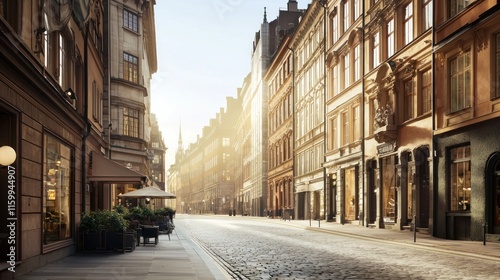 street, city, urban, old, town, architecture, building, house, historic, cobbled, pavement, sunlight, sun, morning, light, gold, hours, calm, peaceful, quiet, empty, deserted, european, travel, tour tourism, vacation, destination, landscape, scenery, view, perspective, shop, store, cafes, eatery, sidewalk, pathway, alley, lane, facades, window, door, detail, brick, stone