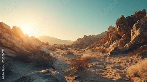 Sunlit desert landscape with rocky formations and sparse vegetation at sunset.