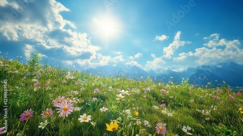flower, meadow, sunlight, sky, cloud, grass, nature, landscape, summer, blooming, vibrant, scenic, daylight, flora, environment, calmness, bright, beauty, cheerful, idylli, rural, hill, sunbeam, tranquil, relaxation, tour tourism, adventure, colourful, fresh, botanical, season, weather, panoramic, exploration, natural, sunshine, bloom, wildflower, green, bio, peaceful, fresh air, cultivation, high-coloured, hillside