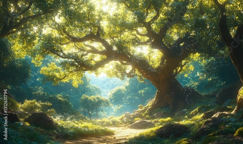 forest, path, tree, sunlight, sunbeam, green, leaf, nature, timberland, wood, magical, mystical, serene, peaceful, calmness, calm, mossy, rock, stone, dirt, trail, journey, adventure, shadow, light, dappled, summer, vibrant, lush, old