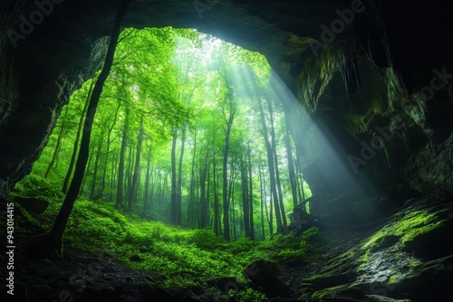 forest, cave, sunlight, beam, shadow, greenery, lush, dramatic, nature, photo, interior, exterior, contrast, dark, light, rocky, serene, mystery, natural, wonder, green, vibrant, stillness, scenery, tranquil, landscape, bright, foliage