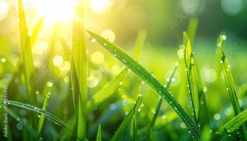 Sunlit Green Grass Blades Adorned with Water Droplets Against Blurred Background