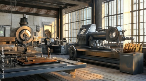 factory, workshop, industrial, machinery, equipment, tool, metal, steel, vintage, antique, retro, old, classic, grunge, rustic, sunlight, window, light, room, space, interior, design, engineering, manufacturing, production, technology, mechanic, craftsmanship, work, job, profession, craft, apparatus, device, industry, building, structure, loft, warehouse, workspace, environment, setting, scene, image