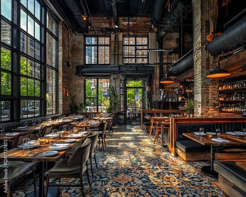 eatery, interior, design, sunlit, industrial, chic, brick, window, carpet, pattern, table, chair, dining, space, room, modern, stylish, sophisticated, elegant, luxury, atmosphere, ambience, light, bright, airy, roomy, comfortable, cosy, warm, inviting, wooden, dark, metal, vintage, rustic, floor, decor, setting, scene, place, view, building