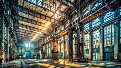 Sunlit Interior of a Derelict Industrial Building with Aged Metal Structures and Large Windows