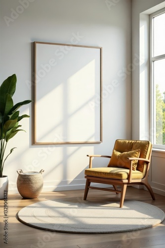 Sunlit living room, large window, minimalist white poster, contemporary, light, clean