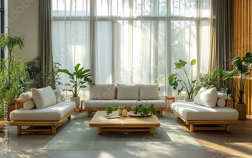 room, interior, design, home, decor, furniture, sofa, couch, living, space, modern, minimalist, contemporary, style, apartment, house, light, bright, sun, window, plant, green, natural, wood, bamboo, calm, peaceful, serene, relaxing, comfort, cosy, cushion, pillow, floor, rug, carpet, table, hot drink, potted, arrangement, aesthetic, ambience, setting, scene, view, day, sunlight, shadow