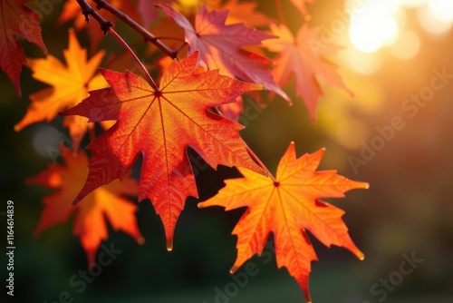 Sunlit maple branch displays fiery hues; leaves in various stages of autumn color change , wood, texture