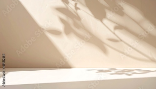 Sunlit minimalist beige interior with delicate botanical shadows, creating a serene and elegant backdrop for modern design or tranquil product displays