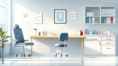 office, doctor, medicals, clinic, health care, hospital, room, desk, chair, sunlight, window, bright, clean, sterile, modern, professional, treatment, exam, medicine, health, wellness, therapy, patient, consultation, appointment, interior, design, workspace, equipment, supply, file, cabinet, shelf, paperwork, plant, comfortable, serene, calm, minimalist, simple, light, airy, roomy, functional, efficient