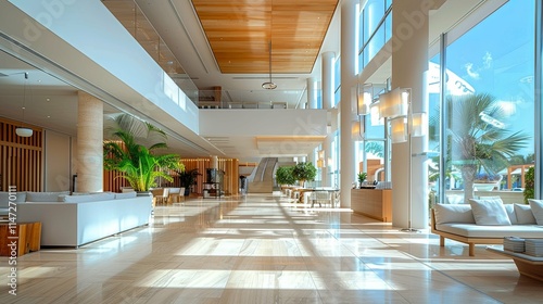 Sunlit Modern Hotel Lobby with Luxurious Furnishings and Expansive Windows