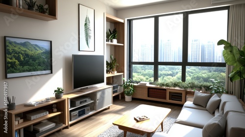 Sunlit modern living room with large , light-wood furniture, flat-screen TV, and potted plants creating a bright urban cityscape atmosphere