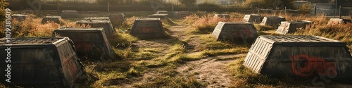 paintball, field, barrel, cover, sunlit, object, game, sport, leisure, competitive, grass, sunlight, morning, fun, activity, battlefield, entertainment, strategy, play, arena, warfare, tactical, team, adventure, combat, shoot, player, equipment, protection, gear, hobby, landscape, nature, environment, empty space, banner, competition, challenge, safety, camouflage, action, teamwork, image