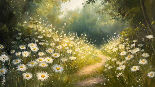 Sunlit path through a blooming daisy field in a serene forest setting during early morning hours