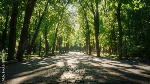 park, path, tree, sunlight, shadow, green, nature, summer, paseo, alley, foliage, landscape, scenery, environment, wood, forest, bright, day, morning, sunshine, serene, peaceful, tranquil, relaxing, cobbled, pavement, road, way, journey, travel, destination, escape, beauty, picturesque, idylli