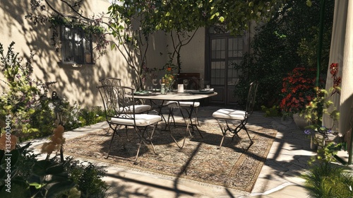 patio, garden, courtyard, table, chair, rug, plant, flower, sun, sunlight, shadow, greenery, leaf, stone, wall, dining, summer, spring, relaxing, peaceful, tranquil, serene, romantic, cosy, charming, beautiful, picturesque, idylli, vibrant, colourful, design, decor, home, house, landscape, architecture, area, space, setting, scene, view