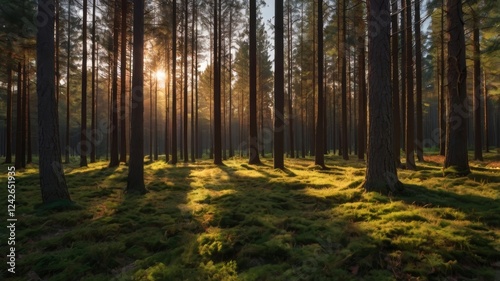 forest, pine, tree, sunlight, dawn, nature, landscape, scenery, wood, green, moss, timberland, tranquil, peaceful, serene, calm, quiet, stillness, golden hour, morning light, sun ray, shadow, canopy, ecosystem, ecology, environment, wilderness, wild, rural, countryside, natural, untouched, pristine, vibrant, lush, greenery, texture, background, photo, image, picture, view