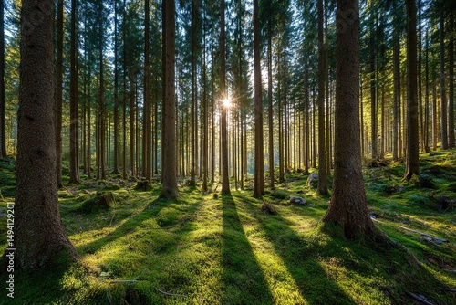 forest, tree, sunlight, wood, nature, pine, sunbeam, daylight, green, brown, shadow, floor, coniferous, sun, ray, light, landscape, trunk, evening, morning, timberland, grass, plant, foliage, ground, cover, evergreen, wood, empty, park, beauty, peaceful, serene, tranquil, calm, stillness, silence, quiet, tall, sunlit, afternoon, gold