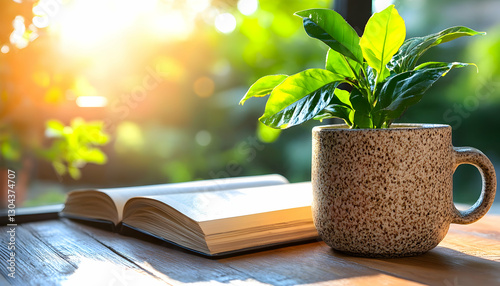 plant, book, sun, sunlight, morning, light, hot drink, cup, mug, table, wooden, garden, green, leaf, nature, reading, relax, peace, calm, calmness, home, comfort, cosy, window, view, spring, summer, indoor, background, still, life, image, photo, picture, aesthetic, botany, growth, germinating, foliage, vibrant, bright, serene, beauty, happiness, inspiration