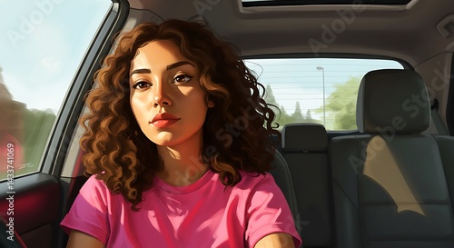 woman, girl, car, vehicle, driving, seat, window, sunlight, sunlit, hair, curly, brown, pink, shirt, t-shirt, face, eye, expression, portrait, illustration, digital, art, artwork, passenger