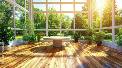 Sunlit room, round table, plants, garden view, peaceful interior, display, presentation
