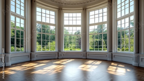 Sunlit Room with Expansive Bay Windows Overlooking Lush Greenery