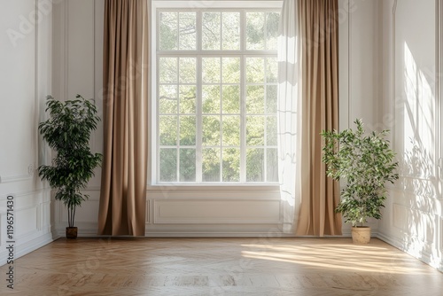room, window, sunlight, sun, light, hardwood, floor, wood, plant, green, interior, design, home, house, apartment, space, empty, clean, bright, modern, elegant, classic, style, decor, curtain, beige, wall, white, panel, architecture, natural, serene, calm, peaceful, cosy, comfortable, roomy, airy, luxury, minimalist, simple, aesthetic, beauty, view, tree, leaf, potted, floorboard, daylight
