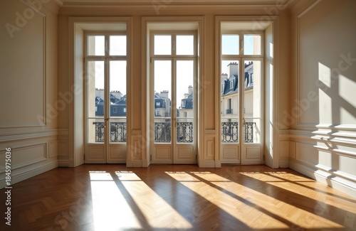 Sunlit room with large windows revealing Parisian architecture. Empty elegant interior features parquet floor and detailed wall molding. Natural light creates geometric patterns on the floor.