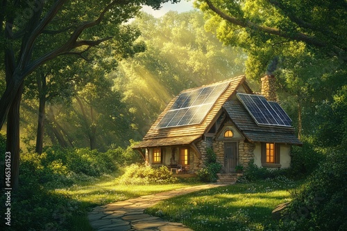 forest, sunlight, cabin, house, nature, path, tree, green, rustic, stone, home, energy, renewable, solar, panel, bungalow, idylli, peaceful, charming, wood, grass, garden, pathway, landscape, summer, daylight, light, warm, exterior, rural, tranquil, calm, sunbeam, eco, sustainable, environment, spring, beauty, design