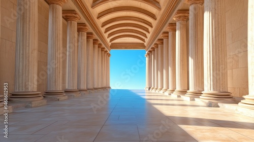architecture, classical, colonnade, pillar, column, arch, hallway, stone, sunlit, bright, sky, ancient, greek, perspective, majestic, grand, building, interior, design, structure, light, shadow, texture, marble, beige, cream, white, blue, horizon, pathway, way, passage, open, space, three-dimensional, rendering, illustration, artistic, elegant, aesthetic, travel, history, culture, heritage, historical building, temple, palace