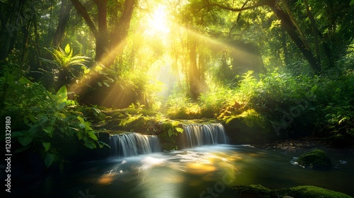 waterfall, rainforest, tropical, sun, sunlight, green, leaf, tree, jungle, nature, water, stream, creek, mossy, rock, forest, plant, sunbeam, ray, light, shadow, lush, vibrant, calmness, serenity, peace, calm, beauty, scenic, landscape, background, image, photograph, photo, environment, ecology, ecosystem, biodiversity, wilderness, wild, natural