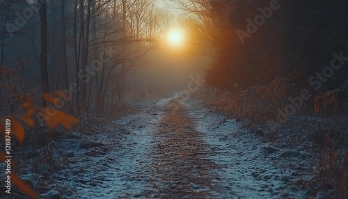 winter, forest, path, sun, snow, sunrise, sunset, foggy, tree, nature, landscape, scenic, misty, morning, evening, tranquil, beauty, sunlight, gold, light, wood, trail, walk, adventure, photo, dreamy, calm, peaceful, travel, hiking, explore, cold, fog, journey, image, photo