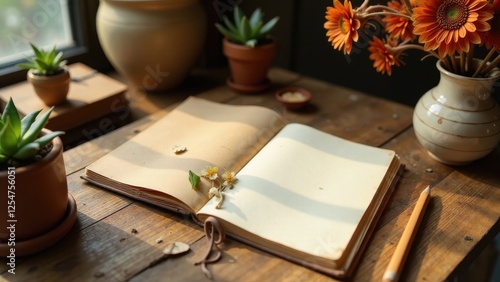 Sunlit Wooden Desk with Open Journal, Small Succulents, and Dried Flowers