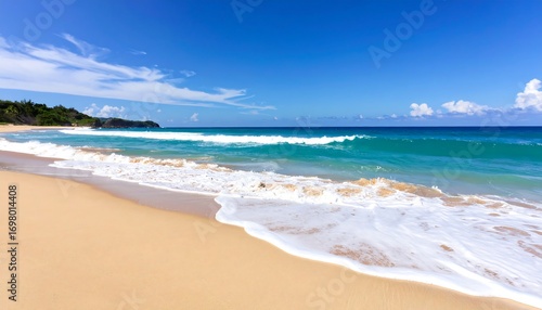 beach, ocean, sand, wave, water, sky, blue, sunny, tropical, shore, coastline, sea, cloud, summer, holiday, vacation, island, paradise, relaxation, scenery, nature, landscape, green, plant, horizon, tranquil, serene, coast, teal, foam, white, crashing, outdoors, day, seacoast, sandy, scenic, seascape, idylli, peaceful, foliage, view, beauty, calm