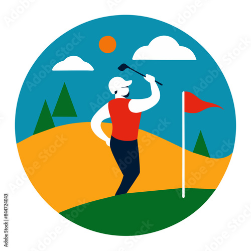 golfer, swing, sunny, outdoors, leisure, hobby, illustration, greenery, landscape, tree, hill, sunshine, cloud, sky, blue, circle, design, flat, vector, activity, competition, recreation, summer, lifestyle, health, wellness, relaxation, sharpened, concentration, aim, precision, challenge, nature, serene, peaceful, calm, tranquil, enjoyment, fun, equipment, athletic
