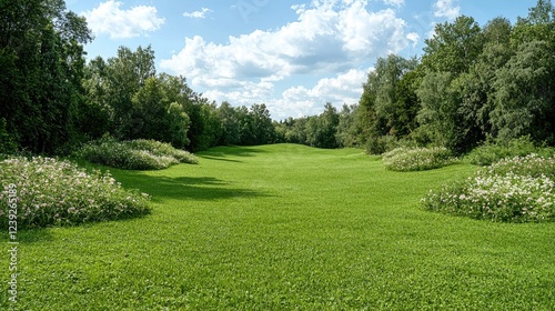 Sunny day, green field, lush forest background, nature scene, landscape photography