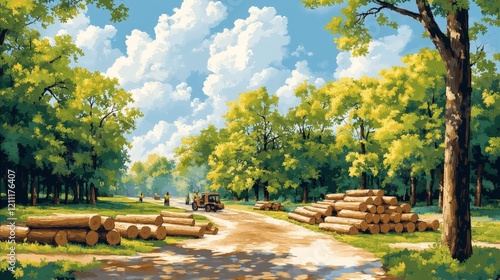 Sunny Forest Logging Road: Tractor & Lumberjacks in Idyllic Nature Scene