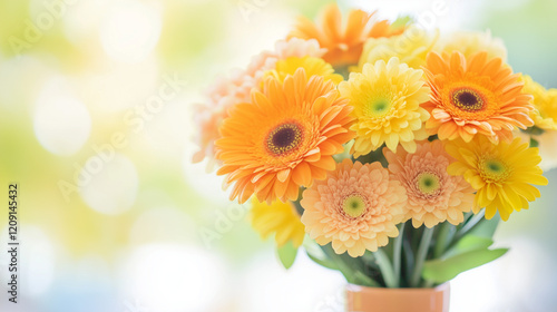 Sunny Gerbera Daisies Bouquet: A vibrant and cheerful bouquet of orange and yellow gerbera daisies in a vase, bathed in soft, warm light. Perfect for adding a touch of sunshine to any space.