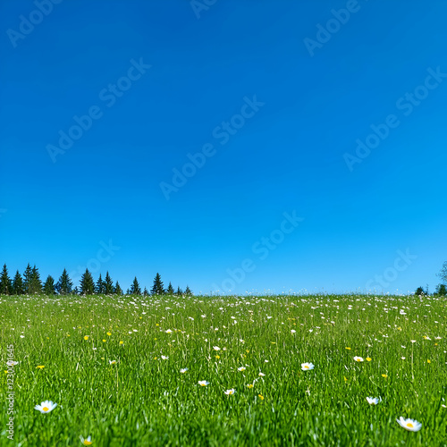 meadow, sunny, sky, field, flower, clear, forest, grass, spring, nature, landscape, summer, green, day, beautiful, scenery, background, rural, environment, calmness, serenity, peace, calm, idylli, vibrant, fresh, bright, light, wildflower, botany, flora, plant, daisy, pasture, horizon, open, view, space