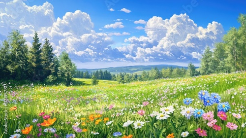 meadow, flower, field, sky, cloud, sun, summer, spring, nature, landscape, green, colourful, vibrant, beautiful, scenic, idylli, tranquil, peaceful, serene, blooming, blossom, wildflower, daisy, flora, botany, plant, vegetation, hill, tree, forest, wood, mountain, horizon, bright, day, sunshine, background, wallpaper, image, photo, picture, art, digital, illustration