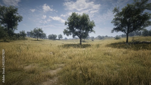 meadow, field, landscape, nature, rural, scenery, outdoors, summer, tree, grass, cattle, pasture, farm, animal, sunlight, cloud, sky, horizon, tranquil, peaceful, open, roomy, gold, golden hour, vibrant, lush, green, brown, yellow, dry, empty, quiet, calm, serenity, grazing, wildlife, countryside, panorama, view, hill, distant, rolling, terrain, farmland, agriculture, farm animal, idylli