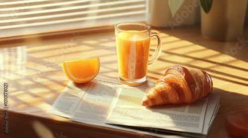 orange, juice, croissant, newspaper, sunlight, breakfast, table, wood, relaxing, morning, fresh, citrous, beverage, food, pastry, slice, glasses, kitchen, home, meal, leisure, warm, weekend, epicure, delicious, healthy, nourishment, lifestyle, calm, comfort, light, shadow, brunch, enjoy, taste, simple, cosy, arrangement, sweet, vibrant, natural, scene, energy, refreshment, bright