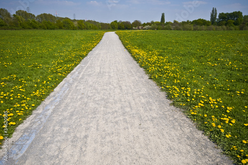 background, beautiful, bloom, blue, bright, cloud, countryside, blowball, field, flower, fresh, grass, green, idylli, landscape, meadow, natural, nature, outdoors, outside, path, rural, scenic, sky, spring, summer, sun, sunny, high-coloured, wallpaper, way, wild, yellow