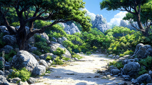 path, landscape, nature, summer, sun, tree, rock, mountain, greenery, foliage, scenic, view, travel, journey, adventure, exploration, environment, ecology, wilderness, vegetation, botanical, flora, sunlight, sunshine, bright, day, light, shadow, beautiful, picturesque, idylli, tranquil, serenity, peaceful, calm, relaxing, escape, get-away, holiday, vacation, destination, tour tourism, road, way, trail, dirt, ground